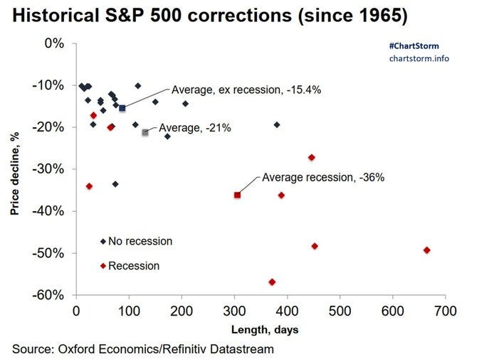 Correction? Recession?Whole In OneMar 13, 2025ShareIf a decline occurs without a recession, It is usually short, fast and shallow.The average is about 3 months, and the decline depth is 15.4%.But when recession comes, it is long, slow, and deep.On average, over 300 days, the decline depth is 36%.